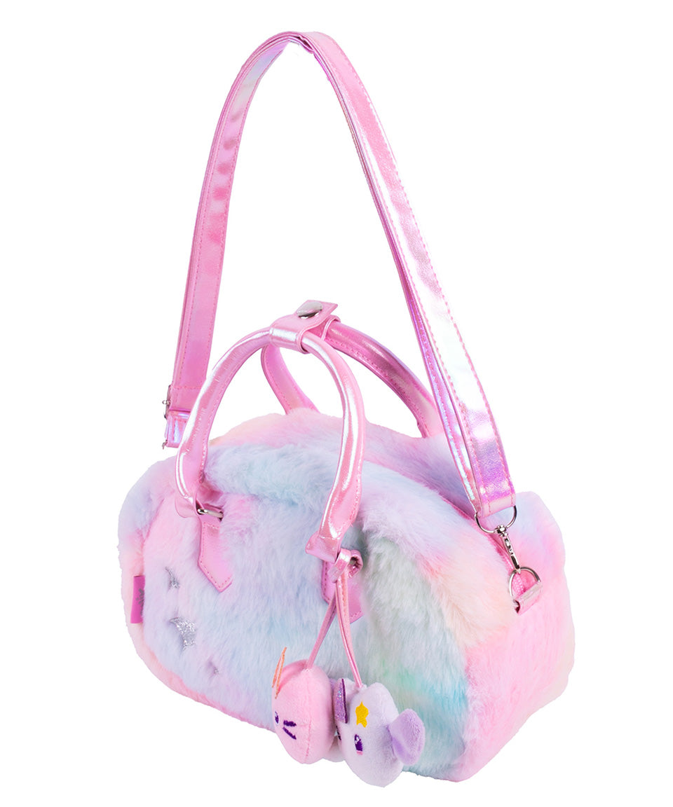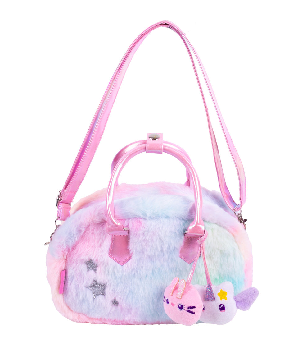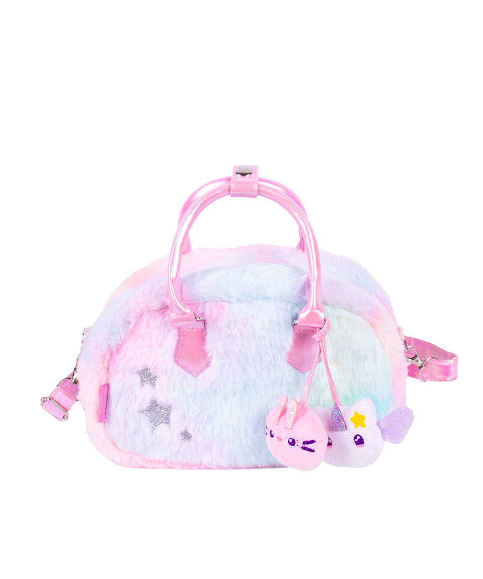 Está elaborada en peluche ultra suave con un diseño en tonos pastel que la hace irresistible. Incluye dos pines de peluche de Little Friends colgantes al frente, que le dan un toque juguetón y súper especial. Además, cuenta con detalles metálicos y aplicaciones en glitter que aportan brillo y fantasía.