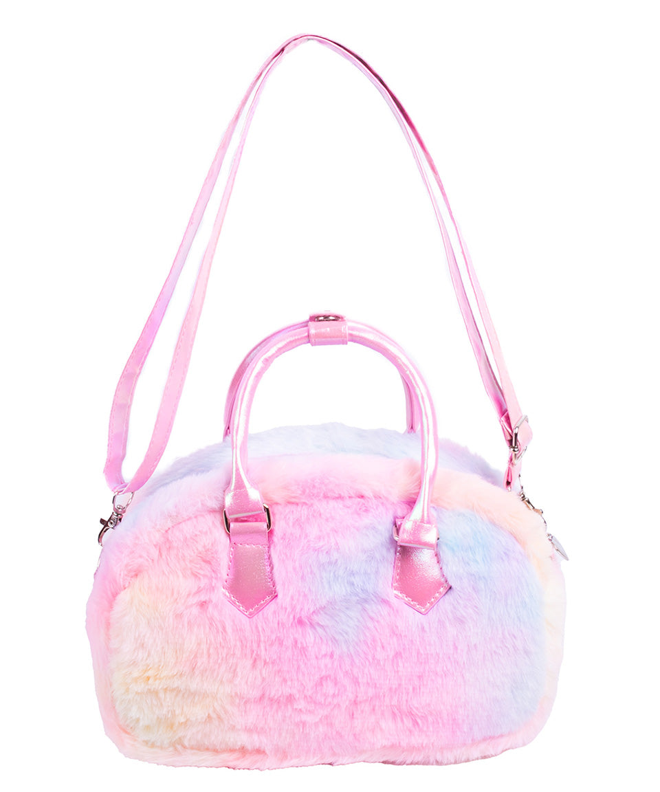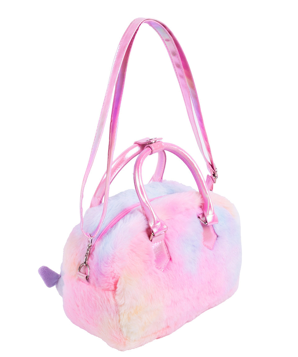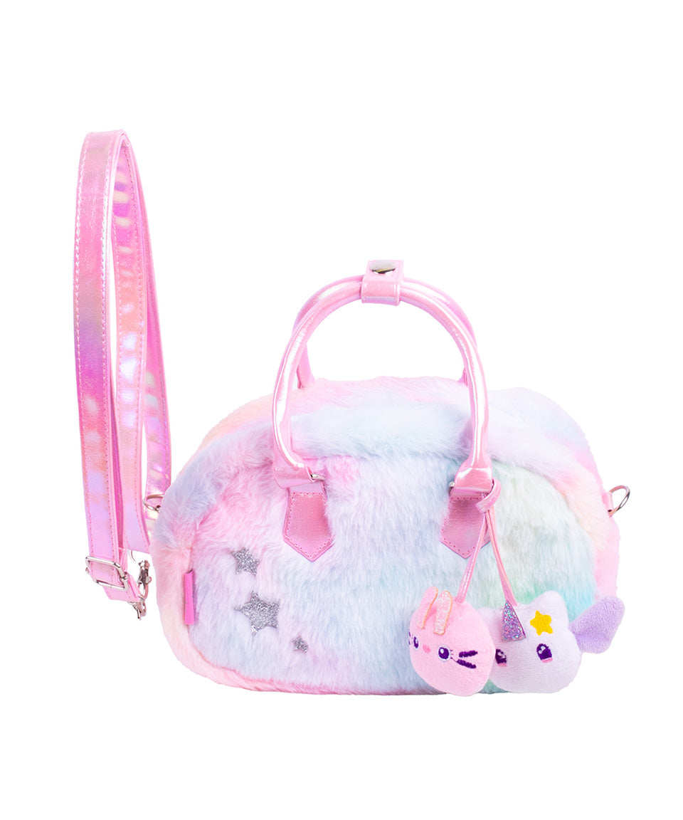 Está elaborada en peluche ultra suave con un diseño en tonos pastel que la hace irresistible. Incluye dos pines de peluche de Little Friends colgantes al frente, que le dan un toque juguetón y súper especial. Además, cuenta con detalles metálicos y aplicaciones en glitter que aportan brillo y fantasía.