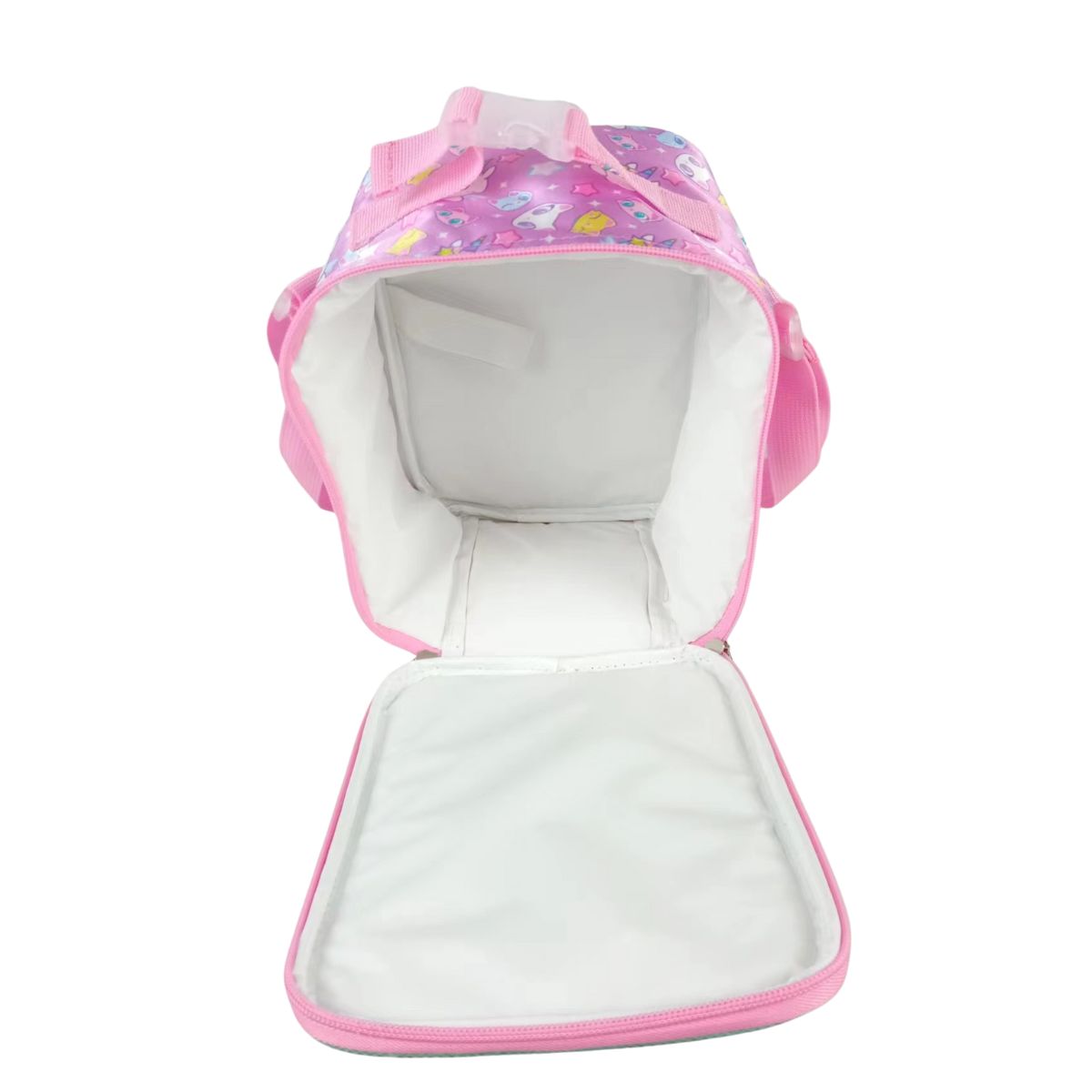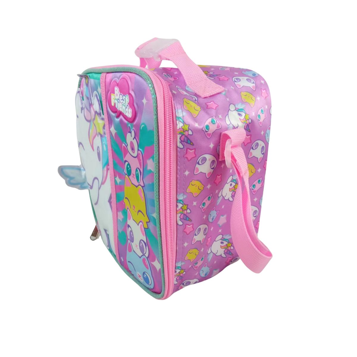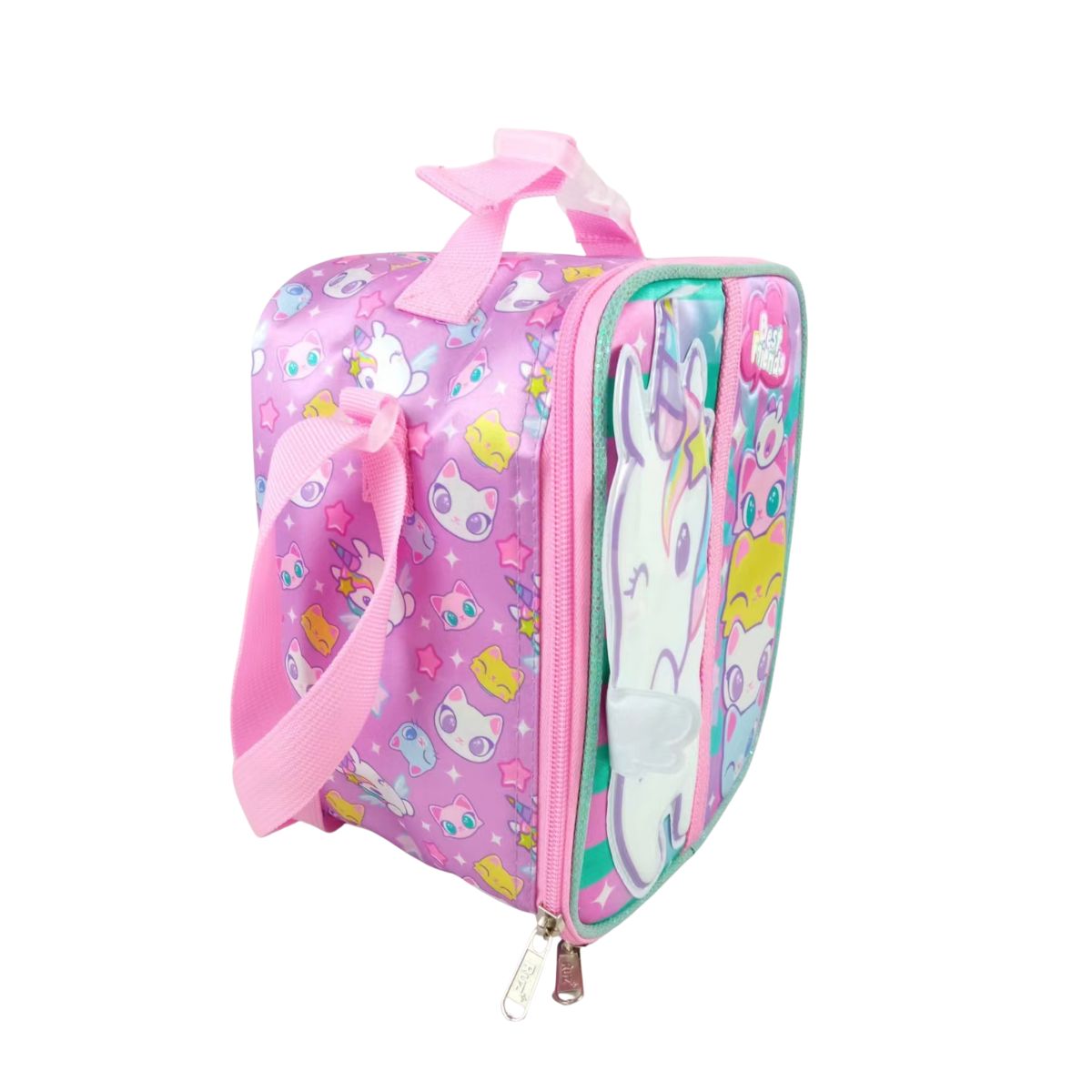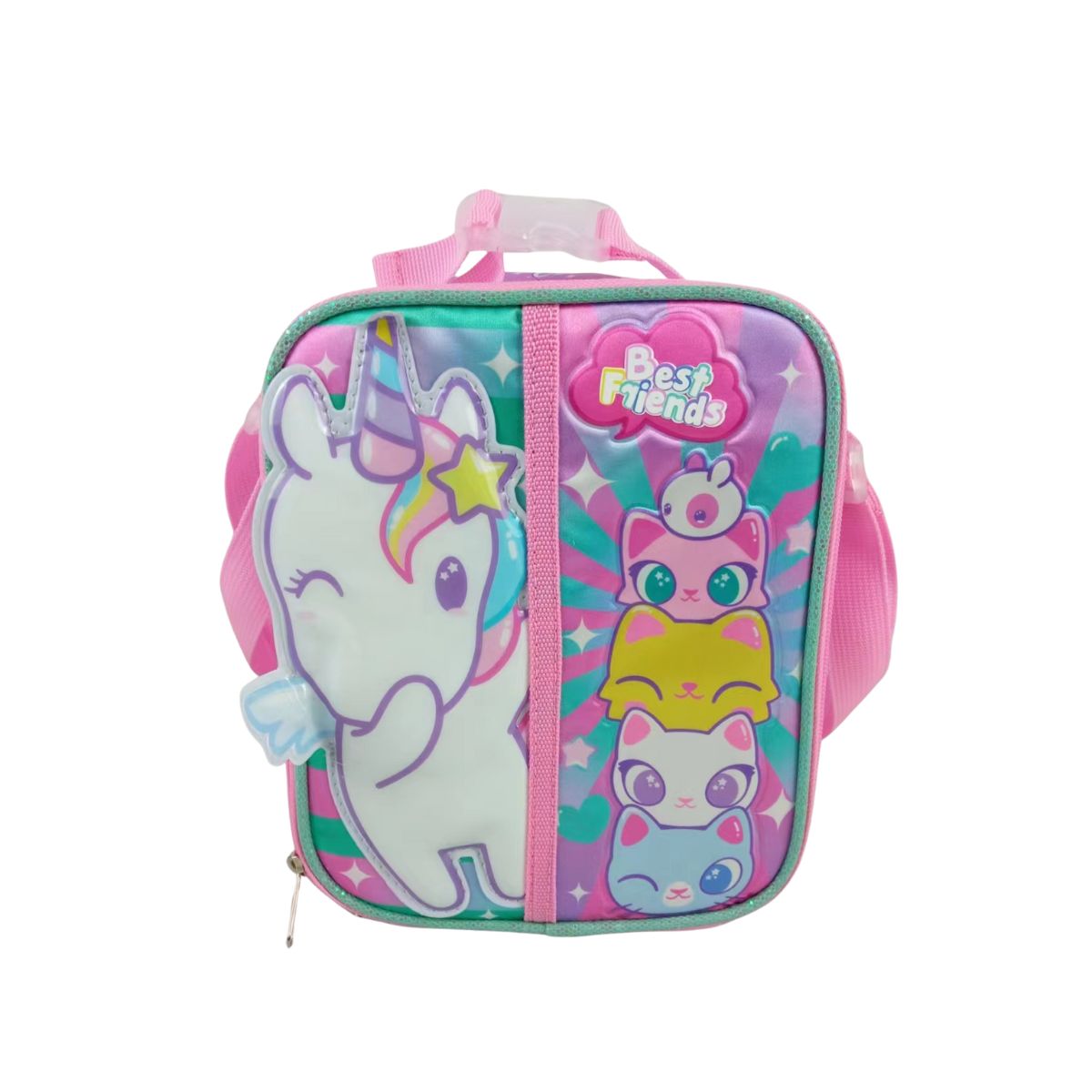La compañera perfecta para el recreo. Esta lonchera está diseñada para niñas que aman la magia, la amistad y los personajes más tiernos. Con su unicornio kawaii y sus gatitos “Best Friends”, cada lunch se siente especial.Su diseño en tonos rosa y verde menta con detalles brillantes combina perfecto con su mochila, creando el set escolar más adorable
