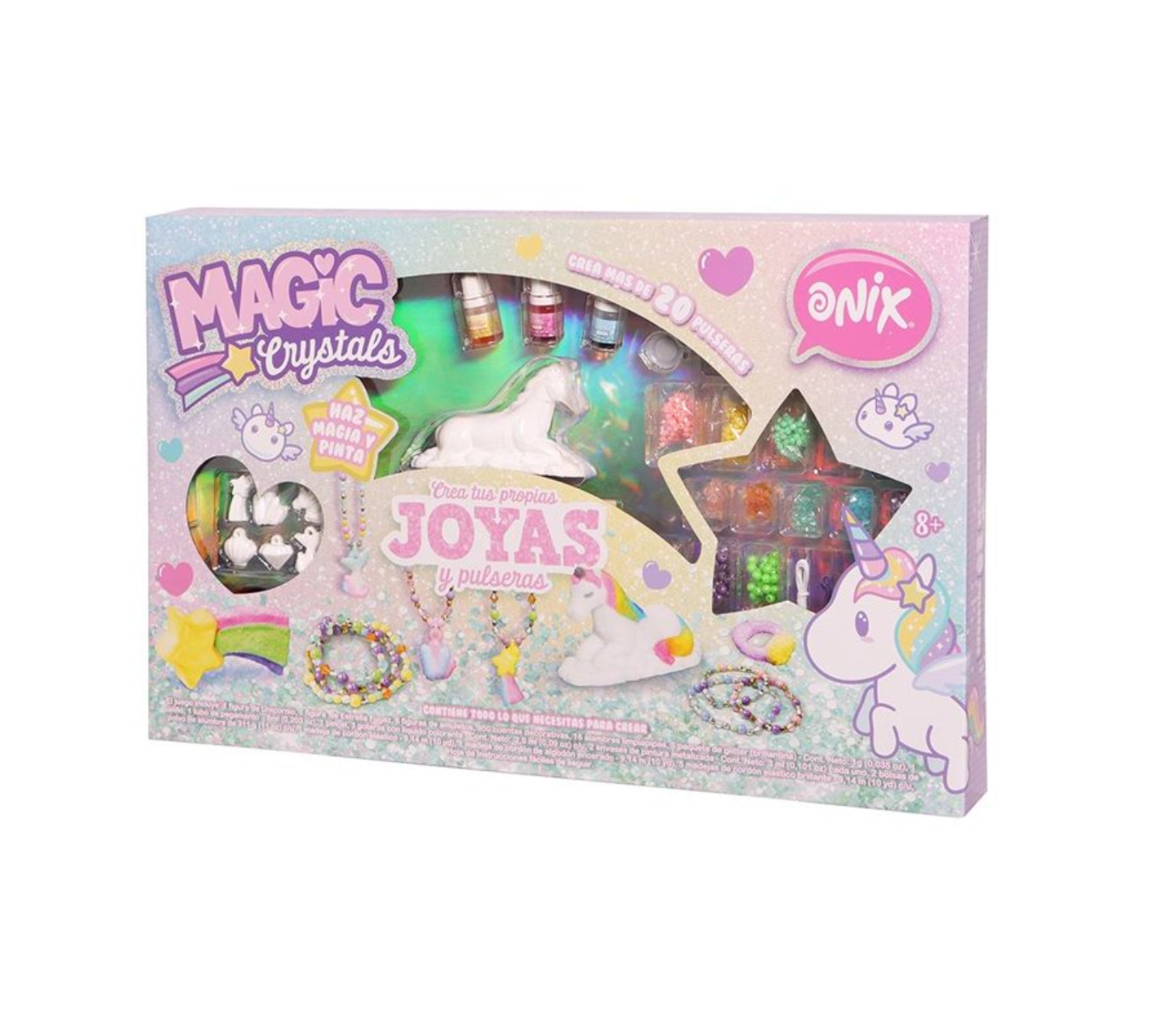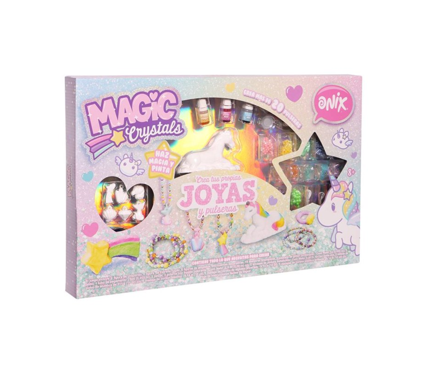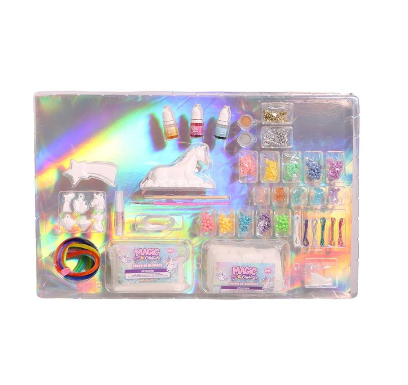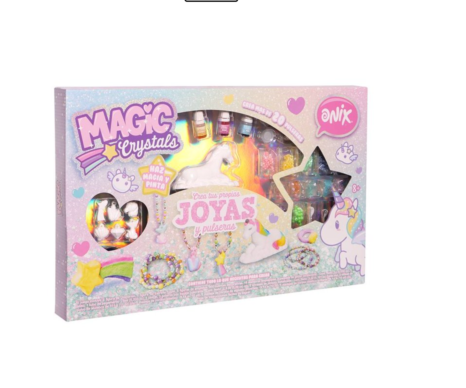 Este set mágico incluye más de 20 accesorios para crear tus propias joyas, además de varias figuras encantadoras: de Unicornio y dijes magicos que aportan un toque especial a cada diseño.